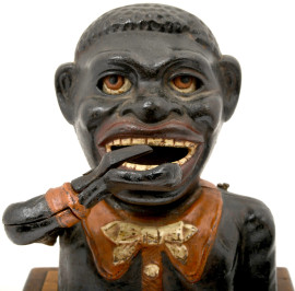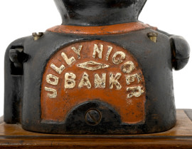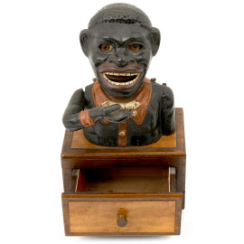 Jolly Nigger Bank, salvadanaio in metallo con cassa in legno alla base. Disegnato nel 1937 da Chris Makrenos. Cm 26,5x14