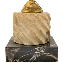 La base, in marmo con motivo scolpito a tortiglione, conferisce ulteriore senso di movimento ascensionale. Ispirata dall'originale di Gianbologna, la scultura di Mercurio sospinta da Zefiro trattiene - non il caduceo - ma un'asta con inserto in pasta di vetro rossa.