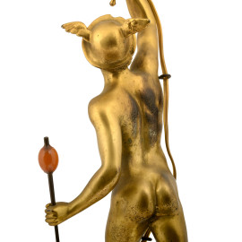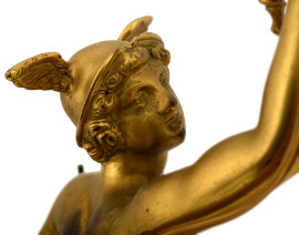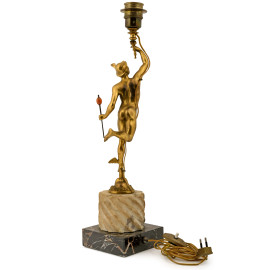 Lampada da tavolo in bronzo dorato raffigurante Mercurio con il braccio teso a sostenere il portalampada. Sistema elettrico da revisionare. XX secolo, cm 54x13,5x13, (difetti)