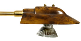 Lampada da terra con struttura in ottone e base circolare in metallo smaltato trattata a finta radica. XX secolo, cm 145x66 (difetti)