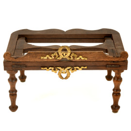 Gambe tornite e motivo sagomato nella parte superiore. Dotato di listelli laterali di sostegno per il posizionamento dei libri. Applicazioni in bronzo dorato a ghirlanda di alloro e nastro intrecciato.