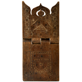 Leggio pieghevole in legno intagliato a motivi geometrici e facciate di templi indù, XX secolo, cm 22x36x19, (difetti)