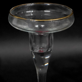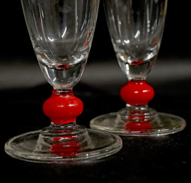 Lotto composto da 2 flutes e 2 coppe da champagne in vetro trasparente con base e nodo decorativo rosso. Prima metà del XX secolo, (cadute di doratura ai profili e difetti)