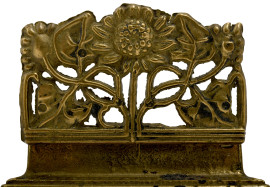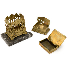 Lotto composto da 2 scatoline in metallo dorato con decorazioni traforate ed a rilievo e da 1 portalettere con struttura in bronzo finemente cesellato a motivi di fiori e foglie stilizzate, base in marmo, XX secolo, cm 13,5x13