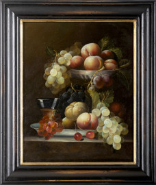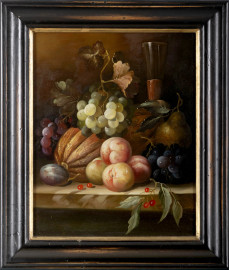 Lotto composto da 3 nature morte di frutta, XX secolo, olio su tavoletta, cm 28,5x22,5 entro cornice, (difetti).