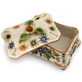 brocca in ceramica dipinta e smaltata con decorazione policroma floreale e motivi astratti nei toni del blu, rosso e verde. XX secolo, cm 27x22x20, (difetti di cottura, cadute di smalto e mancanze); portagioie in porcellana dipinta a mano con decorazioni floreali dipinte e a rilievo, XX secolo, cm 9x113x9 (difetti)
