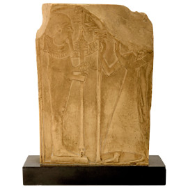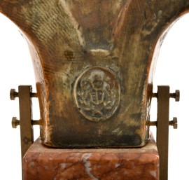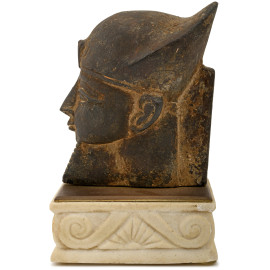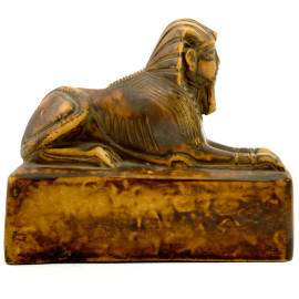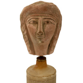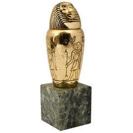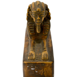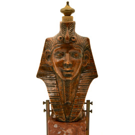 1) scultura in ceramica smaltata raffigurante faraone con nemes su base in marmo rosso e apice in bronzo. XX secolo, altezza cm 18; 2) scultura in pietra su base rettangolare raffigurante sfinge. XX secolo, cm 13x16x5,5; 3) contenitore in metallo dorato su base in marmo verde di ispirazione egizia. XX secolo, altezza cm 14; 4) scultura di giovane faraone in pietra calcarea dipinta su base in marmo zuccherino. XX secolo, cm 14x9x6; 5) scultura in gesso di divinità o figura femminile di ispirazione egizia, su base a tronco di colonna rastremata. XX secolo, altezza cm 20; 6) fermacarte a placca decorativa ad imitazione degli antichi bassorilievi egizi. XX secolo, cm 19,5x15x5