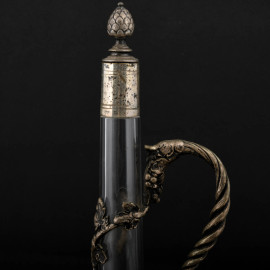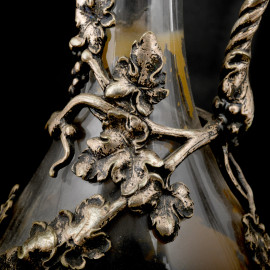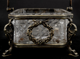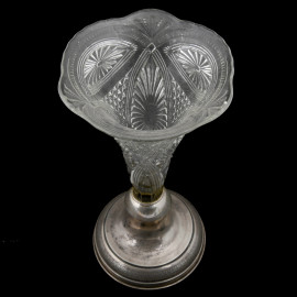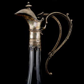 Lotto composto da due versatoi in vetro con inserti in argento e metallo argentato, un calice in cristallo molato con base in argento e un piccolo contenitore con manico in metallo argentato, XX secolo, altezza massima cm 33,(difetti)