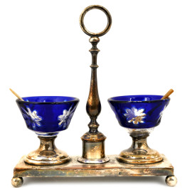 Lotto composto da oliera, zuccheriera e mostardiera in metallo argentato, sheffield e vetro. Dimensione massima cm 25x22