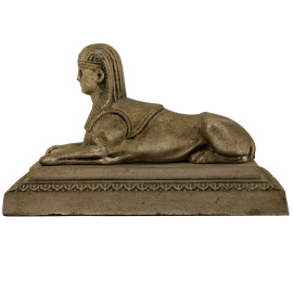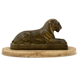 Lotto composto da una sfinge in metallo argentato e un leone in bronzo patinato su base in marmo. (difetti), XX secolo. Misure massime cm 8x13,5x6,5