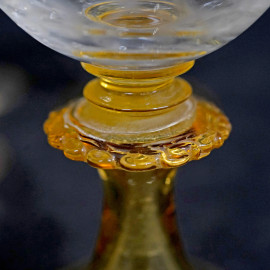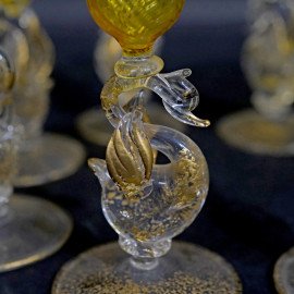 8 bicchieri con coppa svasata di colore ambrato e decoro a spirale. Fusto ornato da figura di cigno in vetro dorato. 3 bicchieri a fusto ambrato con decoro perlinato che sorregge coppa in vetro trasparente con decori a volute vegetali incise