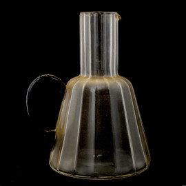 Lotto di 3 bottiglie e un versatoio in vetro con inserti in vetro colorato nei toni del nero e dell'arancio, metà del XX secolo, misura massima altezza cm 26, (difetti)