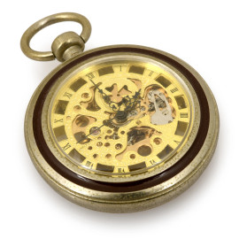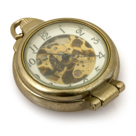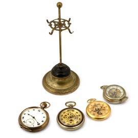 Lotto di 4 orologi da taschino, 3 con meccanismo a vista, uno con quadrante bianco e numeri romani. Completa il lotto una struttura in bronzo a supporto degli orologi. XX secolo, (difetti). Orologi da revisionare.