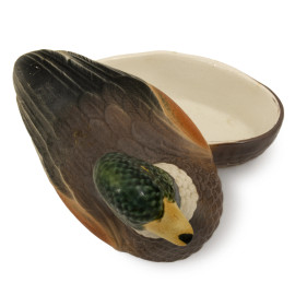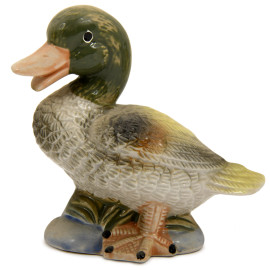 Lotto di 5 papere in ceramica dipinta. La più grande è contenitore. XX secolo, cm 16x20x10, (difetti)