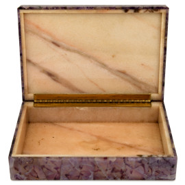 Lotto di cinque scatole portagioie rivestite in marmi e pietre dure, misura massima cm 15,5x5,5, (difetti)