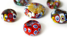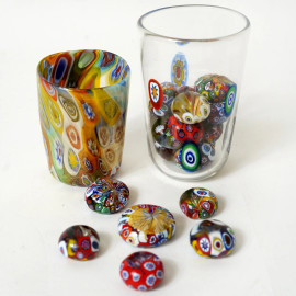 Lotto di due bicchieri realizzati con murrine e oro e 18 sfere in murrine di vetro di Murano. Manifattura muranese del XX secolo, (difetti)