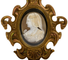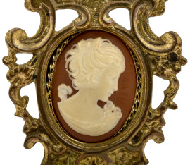 Lotto di due cammei raffiguranti profili femminili, montati entro cornici in metallo dorato finemente cesellato a volute, XX secolo, misure massime cm 13x10, (difetti)