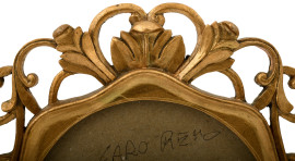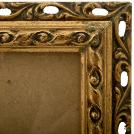 Lotto di due cornici, una in resina trattata a legno dorato con ampie volute e profilo mosso; l'altra in legno dorato e intagliato con volute vegetali e doppio ordine di intaglio. XX secolo, misure masisme cm 29x23; luce cm 21,5x16,5 (difetti)