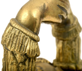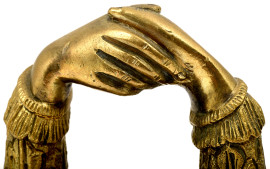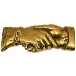 Lotto di due fermacarte in bronzo dorato raffiguranti strette di mani, XX secolo, cm 11x10x8 (difetti)