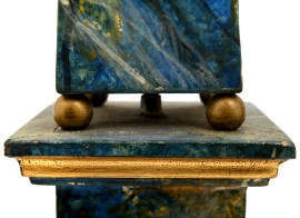 Lotto di due obelischi decorativi in legno dipinto a finto marmo, sorretto da quattro piedini sferici tinti a bronzo poggianti su base rettangolare gradinata, metà del XX secolo, cm 40x10x9, (difetti)