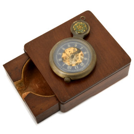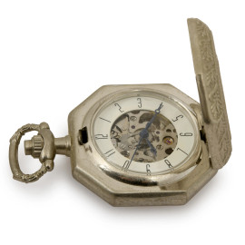 Il primo, a cassa ottagonale in metallo argentato, presenta meccanismo a vista al quadrante e numeri arabi. Il supporto è composto da un elemento in in legno con base ottagonale e fusto costolonato a tortiglione, altezza cm 19; il secondo, con meccanismo a vista e quadrante blu con numeri romani, viene conservato all'interno di una scatolina in legno, con segreto estraibile, cm 7,5x7
