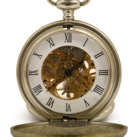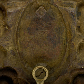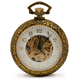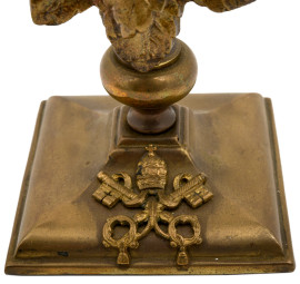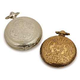 Orologi: 1) orologio da taschino in metallo finemente cesellato e dorato. Meccanismo a vista da revisionare; 2) orologio da taschino in metallo cesellato. Meccanismo a vista da revisionare. Supporto in metallo dorato finemente cesellato con decorazioni a rosette e nastro apicale. Alla base applicazione dello stemma papale, altezza cm 13.