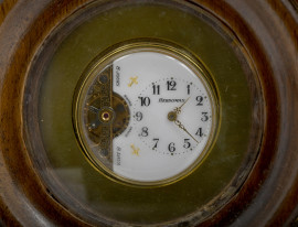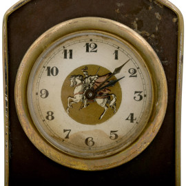 1) Orologio da tavolo in metallo. Quadrante con numerazione araba e decoro centrale di ispirazione epico-cavalleresca, cm 16x9x7,5; 2) Orologio 8 giorni Hebdomas con numerazione araba e lancette decorate in metallo dorato. Manifattura svizzera, XX secolo. Inserito all'interno di una cassa in legno con applicazioni in bronzo e metallo a rosette, candelabre e nastri di ispirazione francese, cm 22x13x7