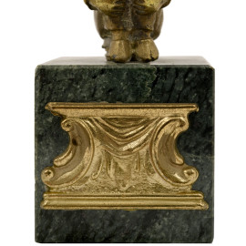 Lotto di due piccoli fermacarte raffiguranti rispettivamente una figura virile e una femminile accovacciate in bronzo dorato. Base in marmo verde con applicazione in bronzo dorato a capitello in rilievo. XX secolo, cm 10x4x4, (difetti)