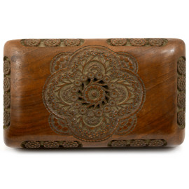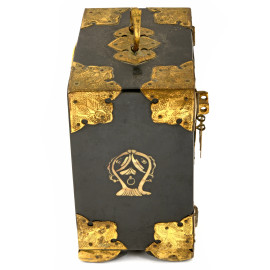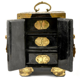 La prima, realizzata in legno, presenta ricca decorazione floreale al coperchio e elementi ornamentali di rosette, XX secolo, cm 20x12x5, (difetti). La seconda scatola è realizzata in legno laccato nero con inserti angolari in metallo dorato lavorato a sbalzo e inciso. Al fronte sono presenti due sportelli con intarsi in pietre dure, questi ripetuti con diverso motivo anche ai fianchi. Boccachiave in metallo dorato lavorato a sbalzo e inciso. All'interno sono presenti tre piccoli cassetti. Piedini sagomati rivestiti in lamina metallica dorata. Cina, XX secolo, cm 14x10x7, (difetti)