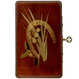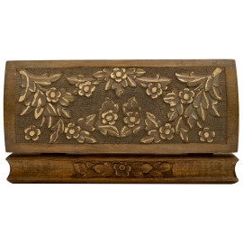 Lotto di due scatole. Una in legno laccato rosso con decorazione di ispirazione orientale al coperchio e applicazioni in bronzo; l'altra in legno con coperchio riccamnete intagliato con decori floreali. Misura massima cm 4x23x10, (difetti)