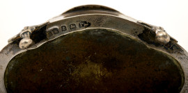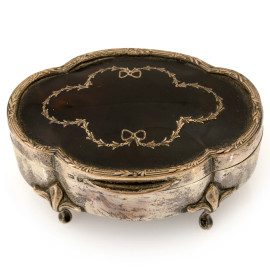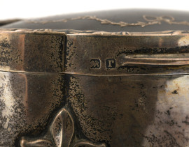 La prima, con coperchio lobato in osso con delicate applicazioni a festone, presenta punzone dell'argento inglese del XIX secolo. Peso lordo gr 70, cm 4x8x5; la seconda in argento, è finemente cesellata con motivi a volute. Peso gr 23, cm 6x3x1. Difetti e segni di ossidazione