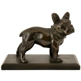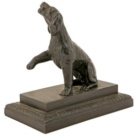 Lotto di due sculture in bronzo patinato nero raffiguranti cani su basi rettangolari, XX secolo. Dimensioni massime cm 10x11x6, (difetti)