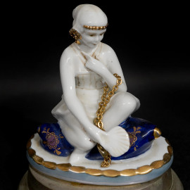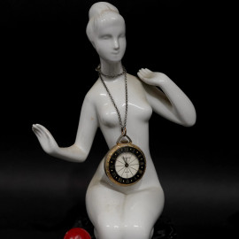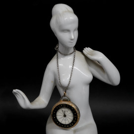 Lotto di due sculture in porcellana raffiguranti figure femminili, una con base in marmo e l'altra con base in argento. La prima presenta orologio da taschino Lucerne Swiss (da revisionare), XX secolo, altezza cm 21; altezza cm 16.
