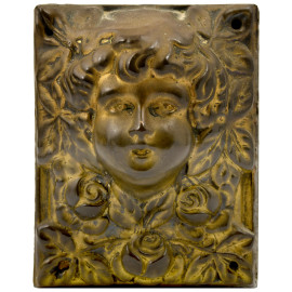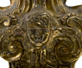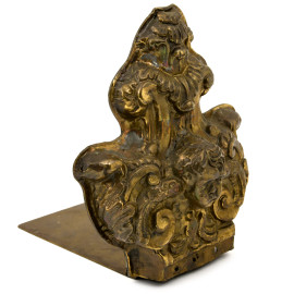 Lotto di sei fermalibri in lamina di ottone lavorata a sbalzo, con decorazioni a rocaille e putti, XX secolo, misura massima cm 17x9,5 (difetti)