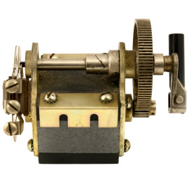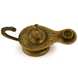 1) Meccanismo a ingranaggi con manovella e rulli; 2) Lampada ad olio con serbatoio in ottone; 3) Piccola lampada orientaleggiante; 4) Morsetto con fronte a timone di nave