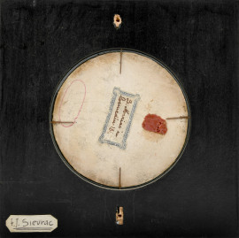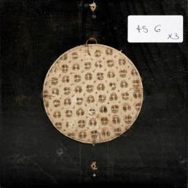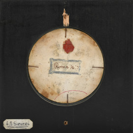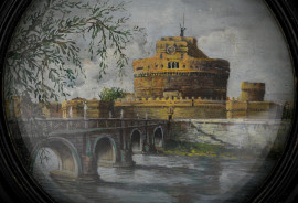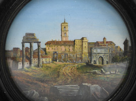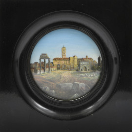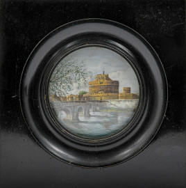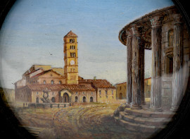 Lotto di tre piccoli dipinti ad olio su cartoncino, raffiguranti Santa Maria in Cosmedin, Ponte Sant'Angelo e una veduta dei Fori, XIX secolo, cm 7,5x7,5 entro cornice (difetti).