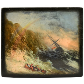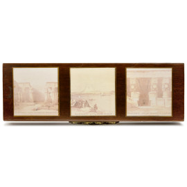 1) Scatola in legno con finiture dorate, decorata con 3 stampe fotografiche d'epoca raffiguranti scene architettoniche ambientate in Egitto applicate sul coperchio. Cassetto a scorrimento sul lato corto. (difetti), cm 3,5x30x9,5; 2) Scatola in legno laccato con stampa di veduta del Vesuvio al coperchio. (difetti),cm 4x21x11; 3) Scatola con coperchio dipinto a mano raffigurante scena marina con un naufragio, firmato in basso a sinistra. (difetti), cm 4x11x9,5