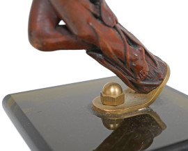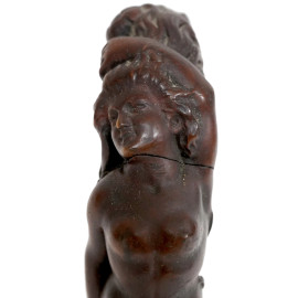 Manico di bastone in legno finemente scolpito con figura femminile dalla posa sinuosa, avvolta din un motivo floreale di ispirazione Liberty. Montato su base non pertinente. XX secolo, cm 17x11x11 (difetti)