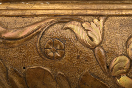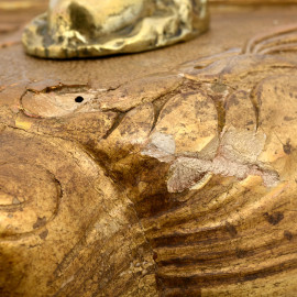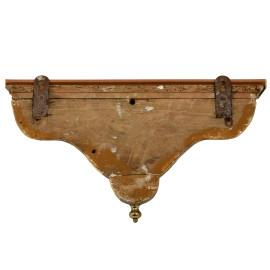 Mensola in legno dorato e intagliato con un ricco decoro a rilievo di volute. Piano non pertinente con decorazione perlinata al profilo. Elemento applicato di testina al centro e terminale a pomo in metallo dorato. XX secolo, cm 24x43x10, (difetti)