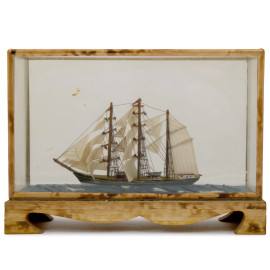 Miniatura di veliero in bacheca in legno dipinto. XX secolo, misure della teca cm 14x19,5x4,5, (difetti)