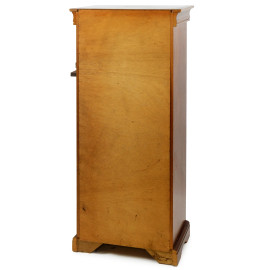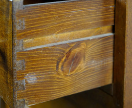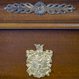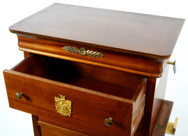 Mobile settimino in noce. Struttura lineare con applicazioni in bronzo e bronzo dorato al centro dei cassetti. XX secolo, cm 124x50x32, (difetti e graffi al piano)