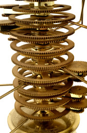 Modello a funzionamento elettrico del sistema planetario. Struttura composta da base in legno laccato nero su cui poggia colonna centrale con sistema di ingranaggi e bracci mobili in ottone. XX secolo, cm 41x51, (difetti). Meccanismo da revisionare