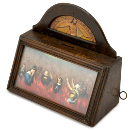 Offertorio in legno con cornice modanata e vano superiore per l'inserimento delle monete, XX secolo, cm 19x22x10, (difetti)