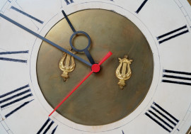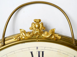 Cassa in bronzo dorato con decori in stile neoclassico. Quadrante circolare a numeri romani con applicazioni dorate nel tondo centrale. Pendolo in ottone dorato con terminale a rosetta. in legno ebanizzato con cornice interna dorata a rilievo.