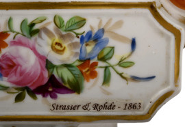 La forma sagomata è impreziosita a decorazioni floreali policrome, motivi dorati e dettagli in rilievo. Il quadrante smaltato presenta numeri romani e lancette in metallo brunito. E' firmato "Strasser e Rohde 1863. Il movimento è meccanico a pesi con catena e pendolo dorato.