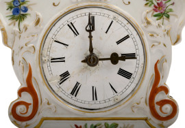 Orologio a pendolo da parete in ceramica decorata. Germania, XIX secolo, cm 24x18, (difetti). Meccanismo da revisionare.