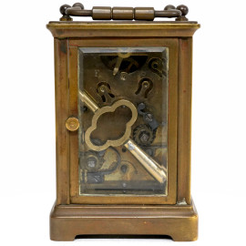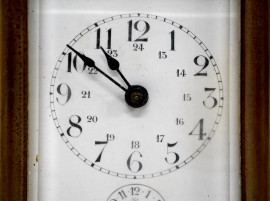 Orologio cappuccina con sveglia. Completa di chiave di caricamento, inizi del XX secolo, cm 9,8x6,5x5. Meccanismo da revisionare (difetti).