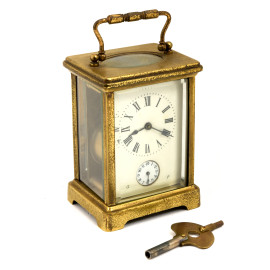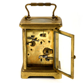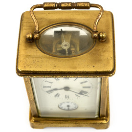 Orologio cappuccina con sveglia. Completa di chiave di caricamento, inizi del XX secolo, cm 11x8x7. Meccanismo da revisionare (difetti).