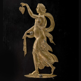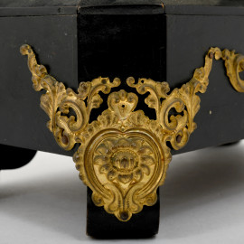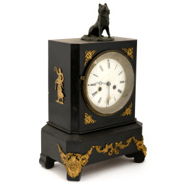 Cassa in lengo laccato nero con applicazioni in bronzo dorato. Parte superiore arricchita da piccola scultura in bronzo raffigurante lupo seduto. Quadrante in smalto bianco con numerazione romana e lancette in metallo traforato.