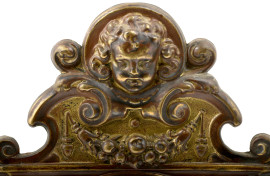 Orologio da parete a pendolo in rame dorato con decori in stile. La cassa presenta elaborato apparato ornamentale con mascherone e testa di putto nella porzione all'apice. XX secolo, cm 37,5x27, (difetti e meccanismo da revisionare)